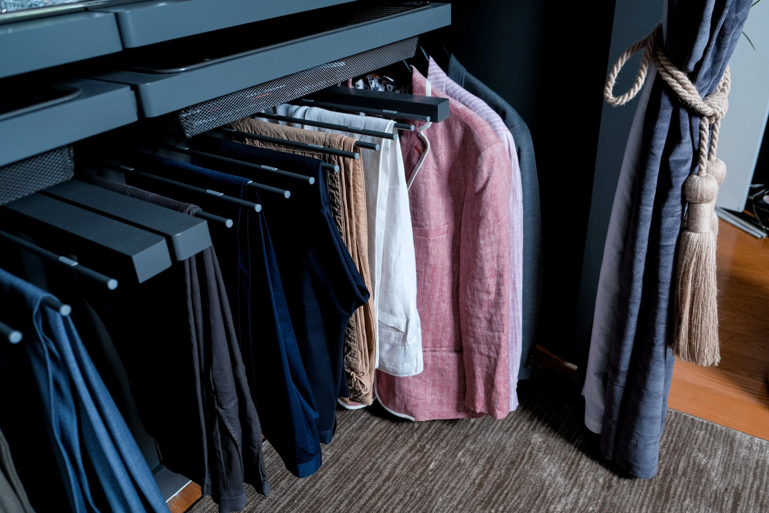 This master closet design was suited for a bachelor, with a priority to highlight his acquired attire while also creating an opportunity to be showcased or concealed.